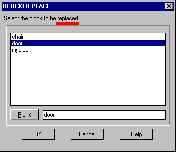 Geben Sie den gesuchten Blocknamen ein, indem Sie ihn im Dialogfenster aus der Liste wählen oder indem Sie ihn durch Anklicken des Pick-Buttons aus der Zeichnung wählen: